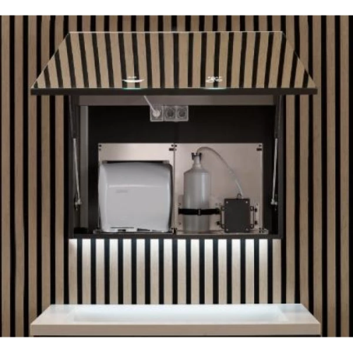Система миття та сушіння рук, інтегрована за дзеркалом, з автоматичним виявленням для економії ресурсів. Прості в установці, модулі регулюються та мають світлодіодні піктограми для інтуїтивно зрозумілого використання. Отримайте мінімалістичні, гігієнічні та організовані туалетні кімнати з цією шафою.