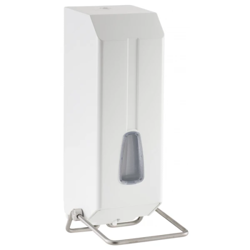 Прямокутний дозатор рідкого мила з ліктьовим пристосуванням, має зносостійкі властивості та стійкий до механічних пошкоджень. Виготовлений  з білого пластику. Має вікно на корпусі  для контролю наповнення рідини.