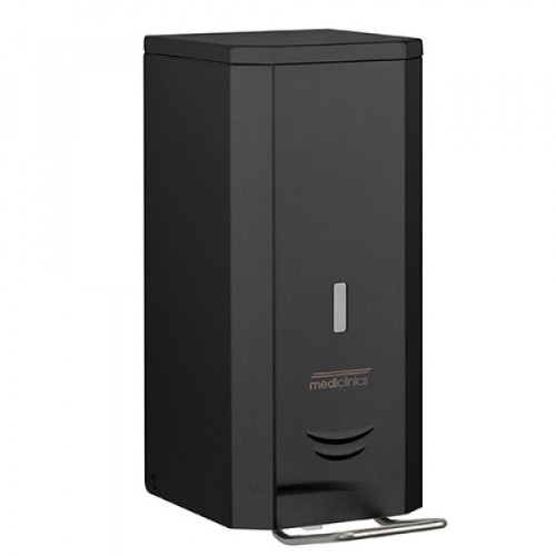 Дозатор для дезінфікуючого засобу ємкістю 1,5 л, виготовлений з нержавіючої сталі AISI 304 товщиною 0,8 мм, пофарбована чорною фарбою, встановлюється безпосередньо на стіну і керується за допомогою важеля із нержавіючої сталі. Ця модель дозатора має функціональний, міцний і модний дизайн, який відповідає новому асортименту аксесуарів для ванних кімнат Mediclinics, що дозволяє цьому диспенсеру ідеально доповнювати будь-який простір.