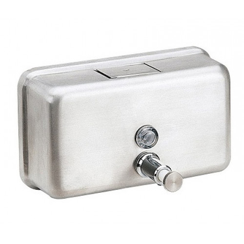 Прямокутний горизонтальний дозатор мила, об'ємом 1200 мл, виконаний з нержавіючої сталі # 304, з сатиновою обробкою. Можна використовувати для мила і для шампуню. Для контролю рівня рідини передбачено кругле віконце.