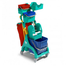 Поліпропіленовий візок на 4-х колесах Ø80 мм з бамперами, одним відром 25л, двома 4-літровими відрами, віджимом TEC, тримачем сміттєвого мішка і лотком великим, у якому…