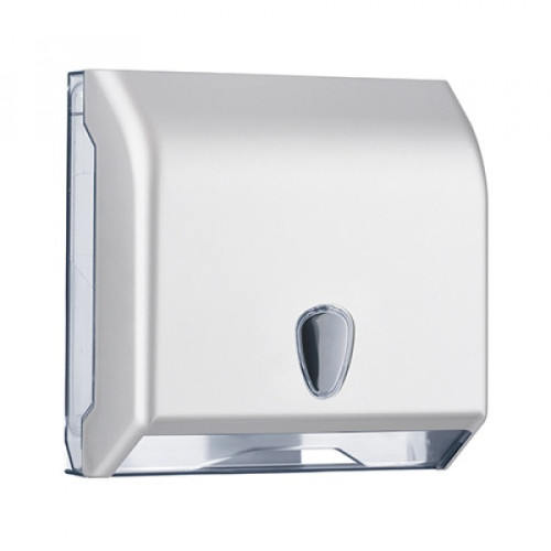 Тримач паперових рушників PRESTIGE, сучасний дизайн підійде для будь-якої санітарної кімнати. Підходить для місць з підвищеними вимогами до комфорту. Виготовлений з високоміцного пластику, колір сріблястий. Тип рушників що використовуються – пачка V-складки. Місткі і надійні, обладнані замком. Простий в обслуговуванні, бічне відкривання кришки - легко перезаповнити.