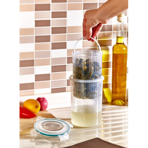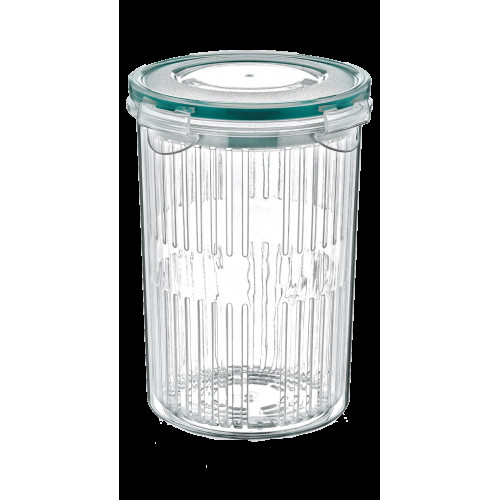 Характеристики Діаметр / висота: 13/18 см Об'єм: 1,5 л Колір: прозорий Опис і застосування Ємність для зберігання з друшляком 1,5 л виготовлена ​​з якісного пластику. Прозорі стінки ємності дозволяють бачити вміст не відкриваючи її.