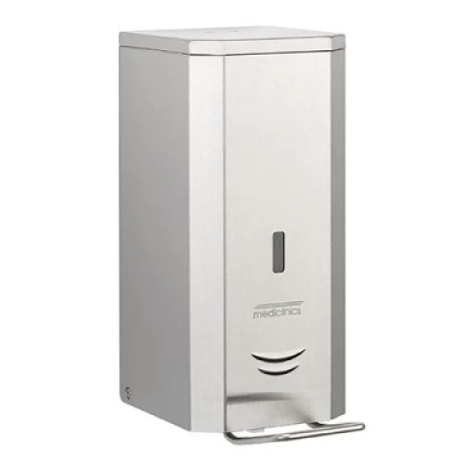 Дозатор для рідкого мила ємкістю 1,5 л, виготовлений з нержавіючої сталі AISI 304 товщиною 0,8 мм, із сатиновим оздобленням, встановлюється безпосередньо на стіну і керується за допомогою важеля із нержавіючої сталі. Ця модель дозатора має функціональний, міцний і модний дизайн, який відповідає новому асортименту аксесуарів для ванних кімнат Mediclinics, що дозволяє цьому диспенсеру ідеально доповнювати будь-який простір.
