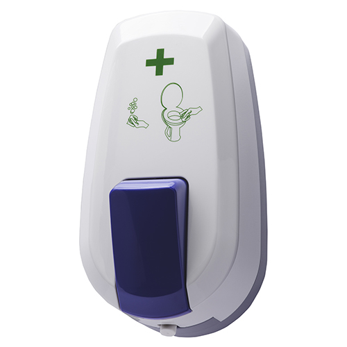 Дозатор для дезинфікуючого засобу наливний - бюджетний варіант, виготовлений з міцного пластику ABS білого кольору. Велика клавіша для натискання виготовлена із синього пластику.