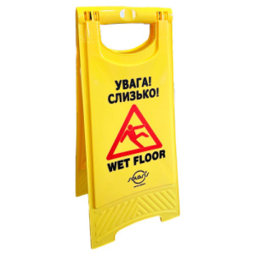 Табличка Обережено слизько встановлюється після вологого прибирання приміщень, для запобігання травмуванню відвідувачів і персоналу.