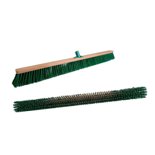 Ця щітка на дерев'яній основі з щетиною з полівінілхлориду (ПВХ) використовується для підмітання промислових підлог таких, як асфальт, кварц, нерафінований бетон і т.п. З'єднання з рукояткою з отвором виконана з пластика. Розмір щітки - 800х55х150 мм Вага щітки - 1 кг. Щіток в коробі -10 шт Щітка для вулиці 100 см. Тип волокна: PET Тип колодки: дерево, бук, з пластмасовим кріпленням для держака з ребрами жорсткості