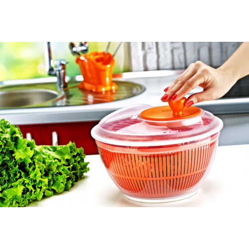 Характеристики Обсяг: 4,75 л Діаметр / висота: 26/16 см Колір: рожевий Опис і застосування Промийте листя салату, овочі, ягоди і розмістіть їх усередині обертається кошика. Цей кошик також може бути використана для миття ягід, грибів, маленьких овочевих листя. Наповніть кошик водою наполовину, розмістіть всередині фрукти і овочі, міцно візьміть і поверніть рукоятку для початку обертання. Вилийте воду і висушіть, прокрутивши ще раз. Прозорий контейнер можна використовувати як миску для салату. Обертову кошик також можна використовувати для просушування гарячої пасти, чищеного картоплі тощо. Обертову кошик також можна застосувати для приготування продуктів глибокого заморожування. Прокрутіть фрукти або овочі і в висушених продуктах не будуть утворюватися кристали льоду. Для розморожування овочів і фруктів з мінімальною втратою соку і без використання мікрохвильової печі, помістіть заморожені продукти в кошик. Таким чином, вони не будуть лежати в крижаній воді. Зручна і корисна річ для будь-якої кухні.
