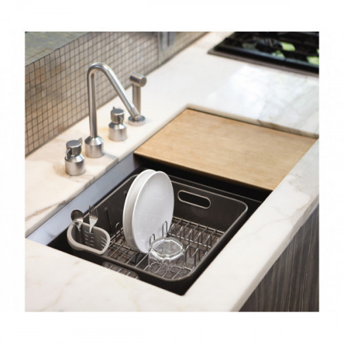 Тримач для посуду достатньо малий, щоб ідеально поміститися у більшість стандартних раковин, повністю звільняє стільницю, здатний водночас вмістити повнорозмірні тарілки. Для використання на стільниці він має поворотний злив, який повертається в будь-якому напрямку, щоб злити воду прямо в раковину. Злив повертається на 360º.