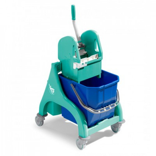 Візок для прибирання виготовлений повністю з пластику, міцний, елегантний, компактний. Має віджим TEC і колеса діаметром 80 мм з бамперами, відро об`ємом 25л, позаду відра невеликий простір для розміщення пляшок і флаконів з мийними засобами.
