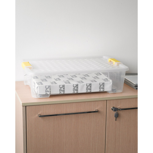 Характеристики Обсяг: 25 літрів Довжина / ширина / висота: 57/39 / 15,5 см Колір: прозорий з жовтими ручками Опис і застосування Ящик подкроватний 25 л прозорий з жовтими ручками і 4 коліщатками дає можливість акуратно зберігати речі під ліжком, в шафах або на балконі. Виріб забезпечений щільно закривається кришкою, завдяки чому вберігає ваші речі від вологи і пилу.